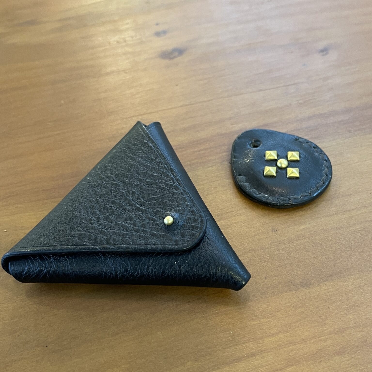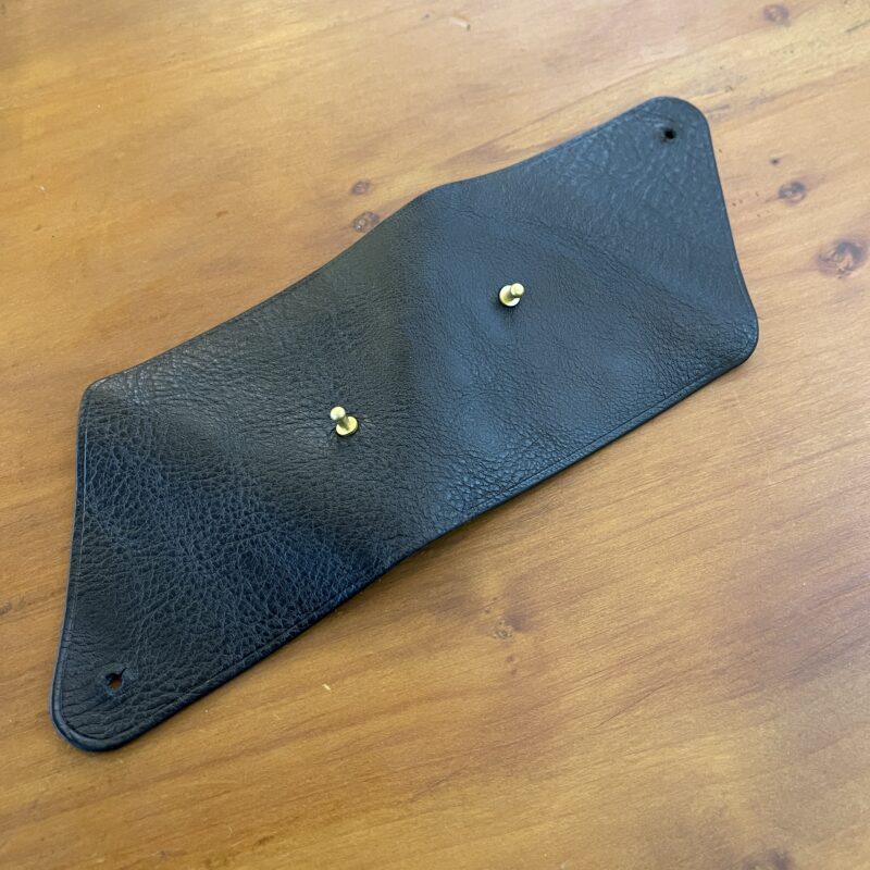 画像の三角コインケースはホックではなくギボシで留める構造のため、ホック打ち具は不要です。