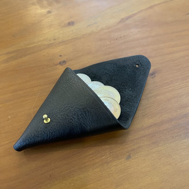 この三角コインケースは糸で縫わないシンプルな構造ですが、革のカット精度やコバ処理の丁寧さによって完成度が大きく変わります。