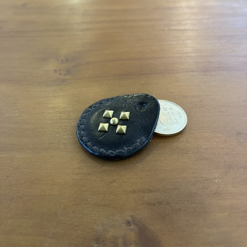 画像のキーホルダーは真鍮製スタッズを取り付け、500円硬貨が1〜2枚入る仕様になっています。シンプルな構造でも、金具をひとつ加えるだけで作品の雰囲気が大きく変わります。